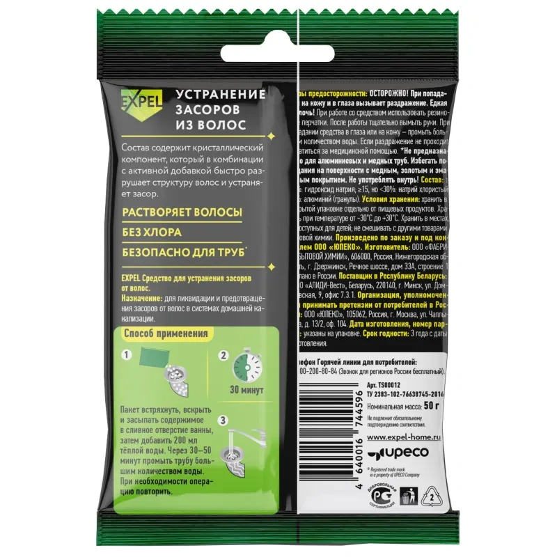 Средство для прочистки труб Expel для устранения засоров от волос саше, 50г