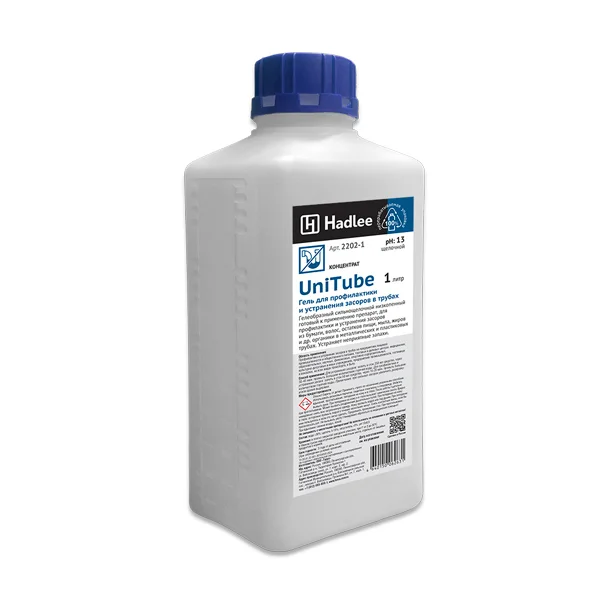 Средство для устранения и профилактики засоров в трубах Hadlee Unitube. Гелеобразный сильнощелочной низкопенный готовый к применению препарат, для профилактики и устранения засоров из бумаги, волос, остатков пищи, мыла, жиров и др. органики в металлических и пластиковых трубах. Отличительные особенности: - не повреждает поверхность; - устраняет неприятные запахи. Способ применения: Для устранения засоров: залить в сток 250 мл средства, через 30-45 мин. промыть большим количеством горячей воды. Для профилактики и устранения запаха: залить в сток 50 мл средства, через 15-20 мин. промыть большим количеством горячей воды. рН 13±0,5