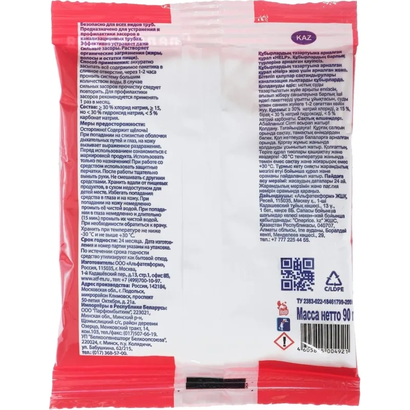 Назначение.Средство для прочистки труб Help саше создано для устранения засоров и неприятных запахов в канализационных трубах. Подходит для раковин, сифонов, очищает от органических загрязнений, жира и волос. Гель подходит для труб различных видов, а густая формула проникает вглубь, даже при наличии воды. Средство быстро устраняет засоры, дарит свежесть.