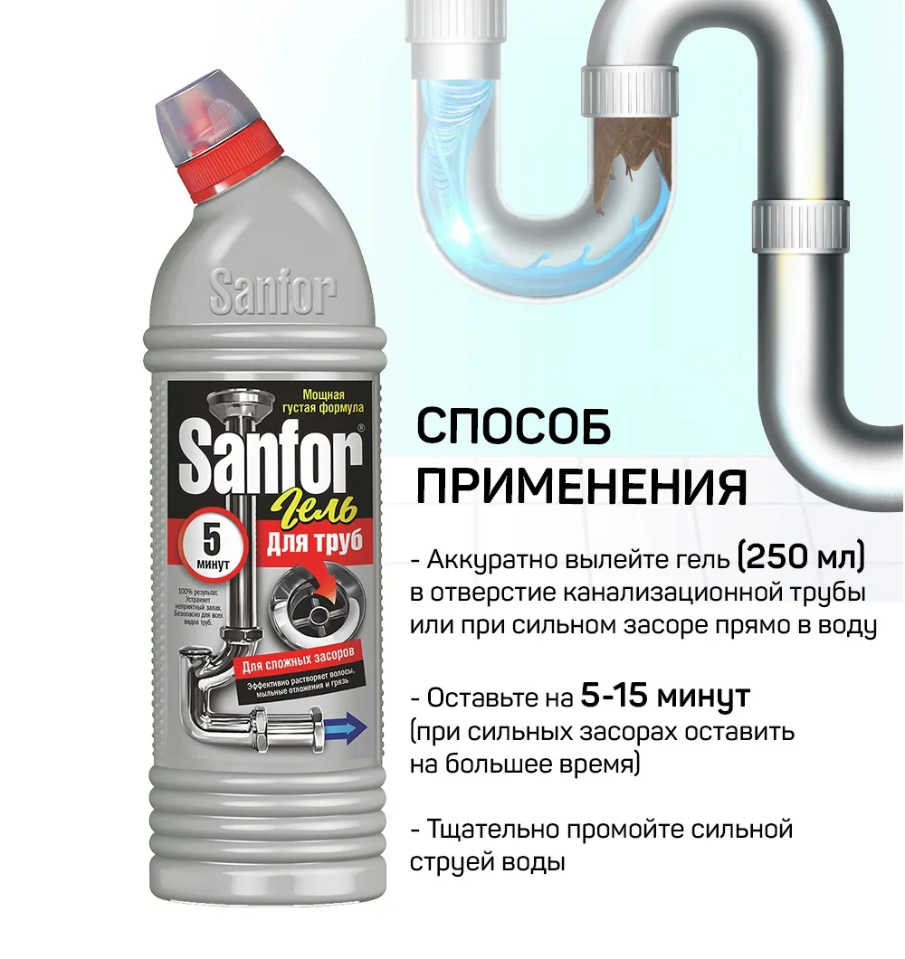 Средство предназначено для профилактики и устранения органических засоров и запахов в сточных трубах гигиенических, кухонных и иных зон.