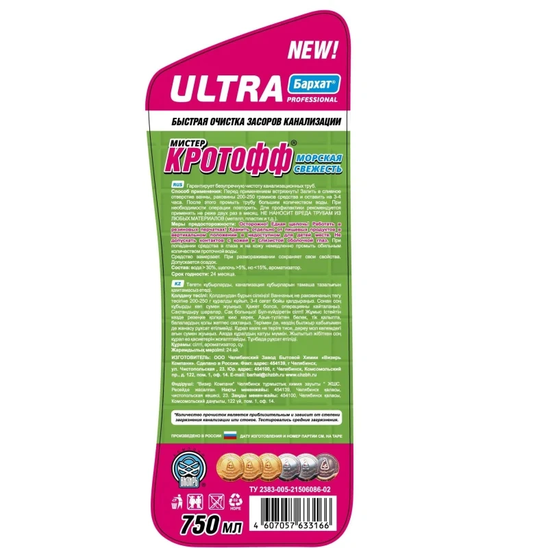 Средство для прочистки труб Бархат Мистер Кротофф Морская свежесть 750г, 750г
