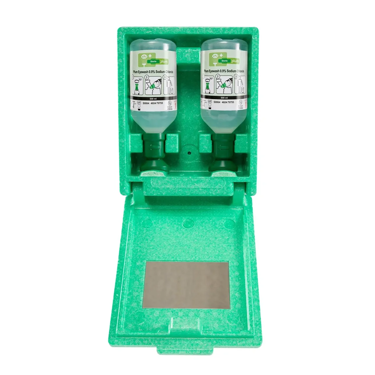 Комплект включает два флакона раствора «Ай-Восс» по 500 мл. Настенный бокс из ударопрочного пенополистирола. Пыленепроницаемый. Внутри крышки зеркало с эффектом увеличения изображения. Комплектация: 2 флакона раствора «Ай-Восс». Модель Eye Wash. Объём 500 мл. Бокс в комплекте.