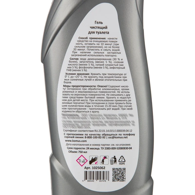 Состав: вода деионизированная (≥30%), анионный ПАВ (≥5%, но <15%), натрий хлористый (≥5%, но <15%), неорганические кислоты (≥5%, но <15%), неионогенный ПАВ (<5%).