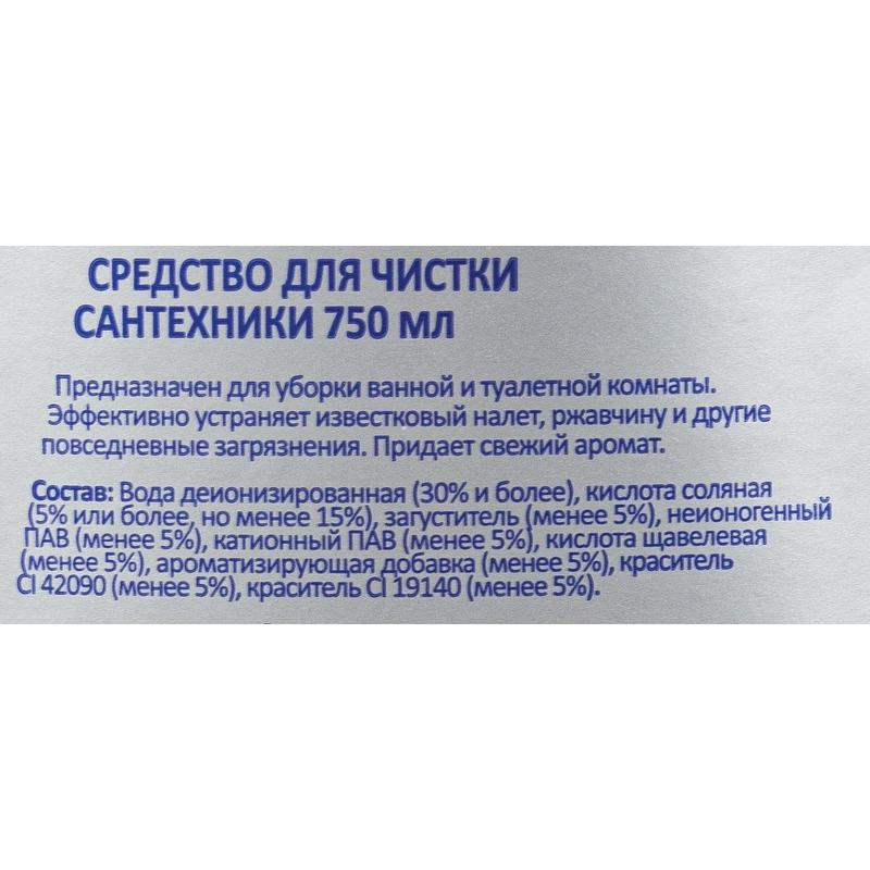 Состав: вода деионизированная (30% и более), кислота соляная (5% или более, но менее 15%), загуститель (менее 5%), неионогенный ПАВ (менее 5%), катионный ПАВ (менее 5%), кислота щавелевая (менее 5%), ароматизирующий компонент (менее 5%), краситель CI 42090 (менее 5%), краситель CI 19140 (менее 5%).