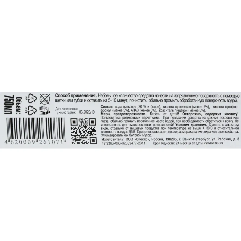 Состав: вода питьевая (30 % и более), кислота щавелевая (менее 5%), кислота ортофосфорная (менее 5%), ПАВ (менее 5%), краситель пищевой (менее 5%).