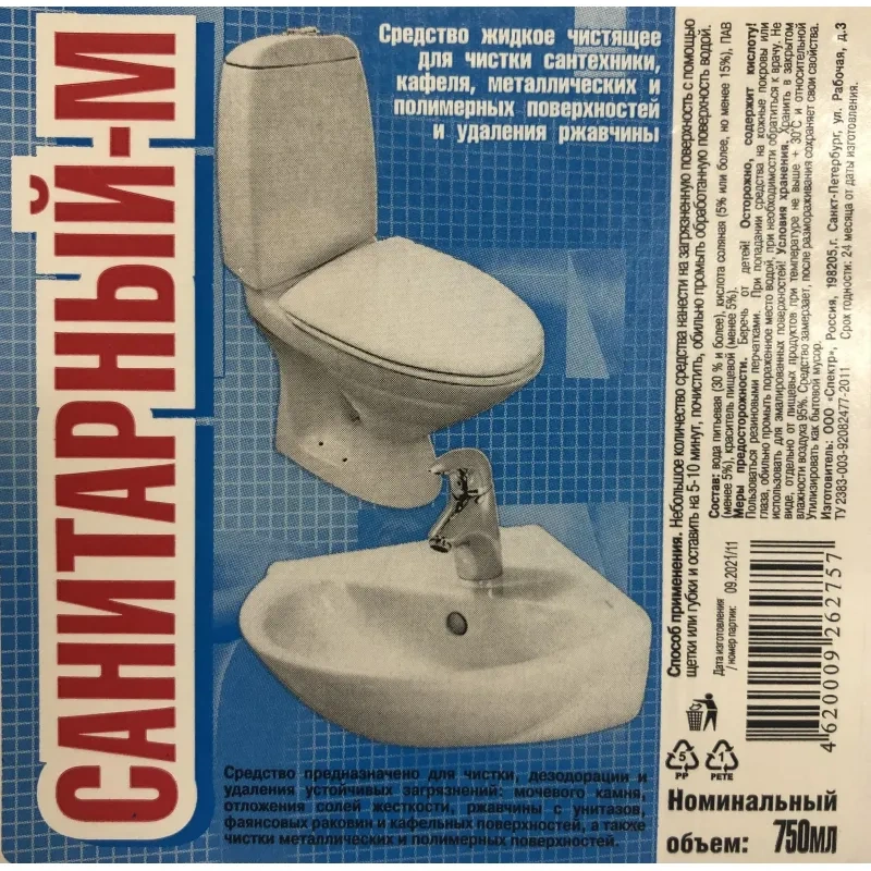Назначение: жидкое чистящее средство для сантехники, кафеля, металлических и полимерных поверхностей, а также для удаления ржавчины. Предназначено для чистки, дезодорации и устранения устойчивых загрязнений: мочевого камня, отложений солей жёсткости, ржавчины с унитазов, фаянсовых раковин и кафельных поверхностей, а также для очистки металлических и полимерных поверхностей.