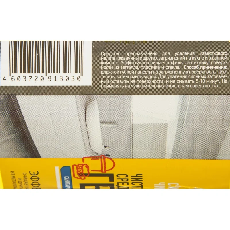 Меры предосторожности: средство предназначено для удаления известкового налёта, ржавчины и других загрязнений в кухне и ванной комнате. Эффективно очищает кафель, сантехнику, поверхности из металла, пластика и стекла. Использовать резиновые перчатки. Избегать попадания в глаза и на кожу. При попадании тщательно промыть большим количеством воды, при необходимости обратиться к врачу.
