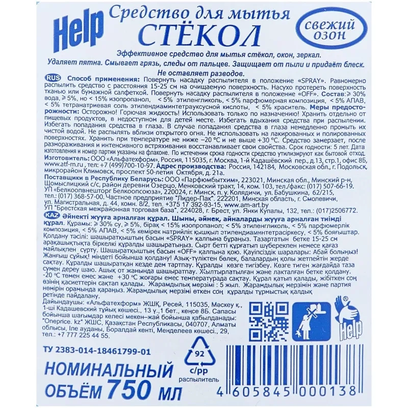 Средство для стекол и зеркал HELP Свежий озон 0,75л_т/г