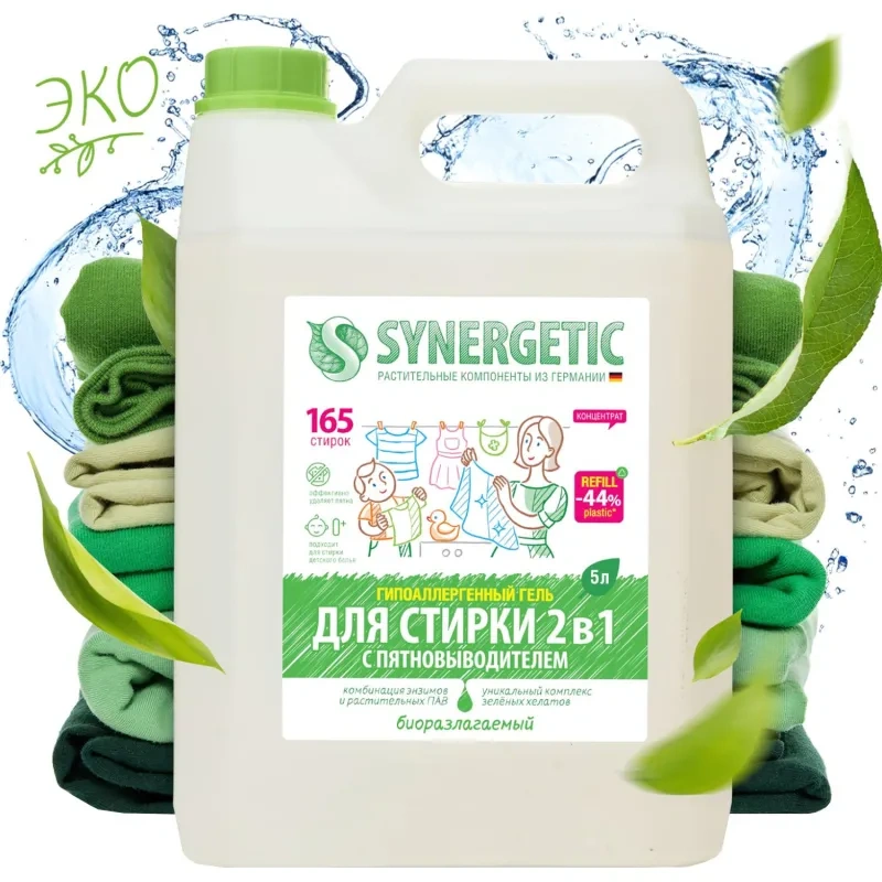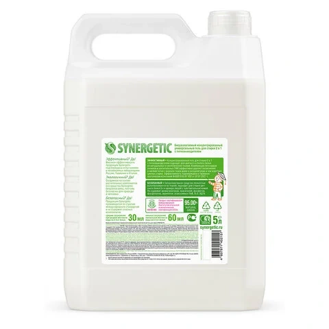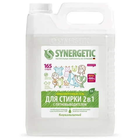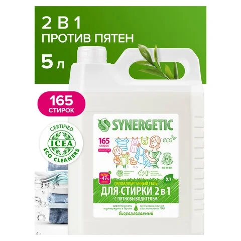 Средство для стирки жидкое автомат 5 л, SYNERGETIC '2 в 1', для всех видов тканей, гипоаллергенное,