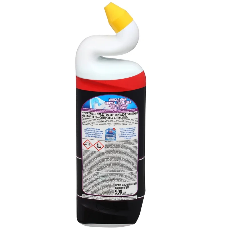 Туалетный Утенок 'Чистящее средство для унитазов Антиналет' обеспечивает бескомпромиссную чистоту и свежесть унитаза, эффективно удаляет известковый налет и ржавчину, без хлора в составе. Уникальная форма горлышка позволяет гелю лучше попадать в труднодоступные места скопления бактерий под ободком унитаза. Обладает дезинфицирующим эффектом - убивает 99,99% вирусов и бактерий. Устраняет неприятные запахи. Гель экономично расходуется, равномерно распределяется по поверхности и действует даже под водой. Чистящее средство Туалетный Утенок необходимо применять только для очищения унитаза. Попробуйте также Стикеры Чистоты от Туалетного Утенка для поддержания чистоты и свежести в туалете!