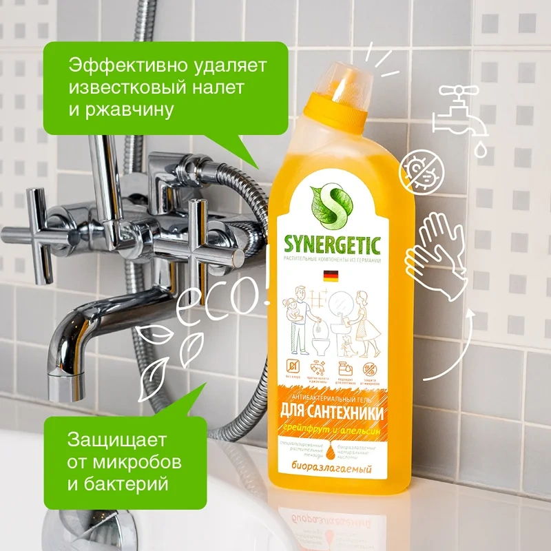 Концентрированное биоразлагаемое средство для мытья сантехники Synergetic Грейпфрут и апельсин – универсальное чистящее средство для ежедневной уборки поверхностей, устойчивых к кислотным моющим средствам, в ванных комнатах и санузлах: унитаза, раковины, ванны, душевой кабины, керамической плитки, акриловых, фаянсовых и эмалированных поверхностей. Комплекс натуральных кислот (лимонной, гликолевой и молочной) и Н-тензидов, полученных из растительного масла, устраняет известковый налёт, ржавчину, камень и минеральные загрязнения даже в холодной и жесткой воде. Средство с антибактериальным эффектом убивает микробы и бактерии, а также эффективно устраняет неприятные запахи. Гипоаллергенная отдушка с маслами грейпфрута, апельсина, померанца и мандарина оставляет свежий аромат. Международный сертификат ICEA подтверждает биоразлагаемость, безопасность и эффективность средства. Гель полностью смывается водой, безопасен для септических установок. Не содержит: хлор, фосфаты, оптические отбеливатели, SLS, SLES, агрессивные кислоты и ПАВ.