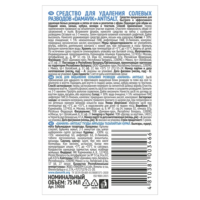Средство для удаления солевых разводов Damavik Antisalt, 75мл