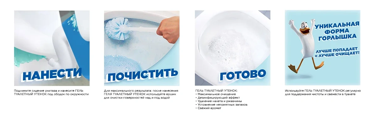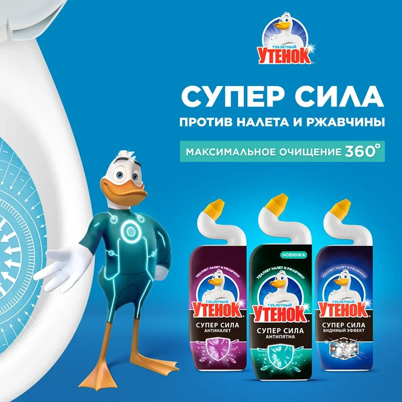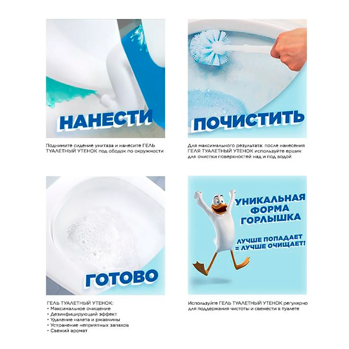 Туалетный Утенок Чистящее средство для унитазов Антиналет обеспечивает бескомпромиссную чистоту и свежесть унитаза, эффективно удаляет известковый налет и ржавчину, без хлора в составе. Уникальная форма горлышка позволяет гелю лучше попадать в труднодоступные места скопления бактерий под ободком унитаза. Обладает дезинфицирующим эффектом - убивает 99,99% вирусов и бактерий. Устраняет неприятные запахи. Гель экономично расходуется, равномерно распределяется по поверхности и действует даже под водой. Чистящее средство Туалетный Утенок необходимо применять только для очищения унитаза. Попробуйте также Стикеры Чистоты от Туалетного Утенка для поддержания чистоты и свежести в туалете.