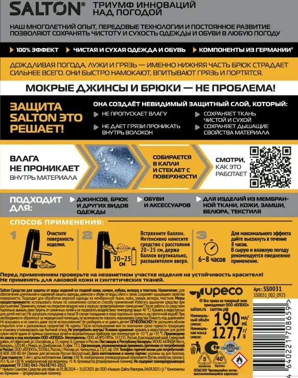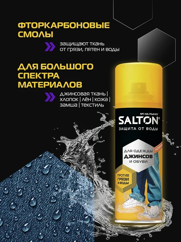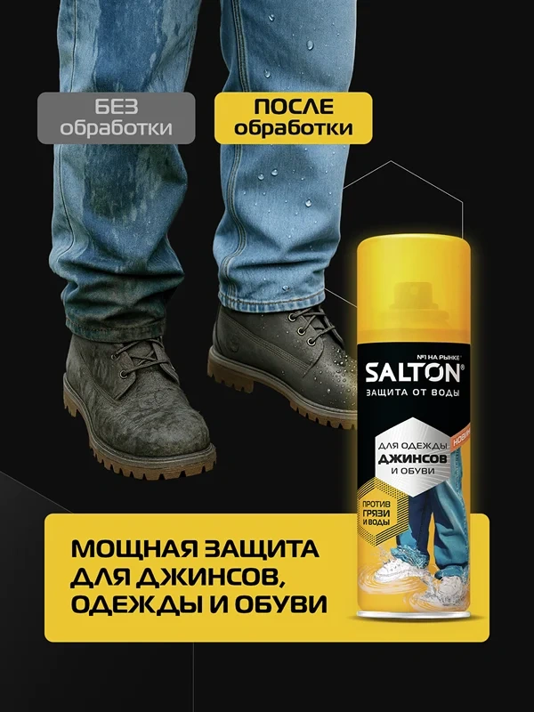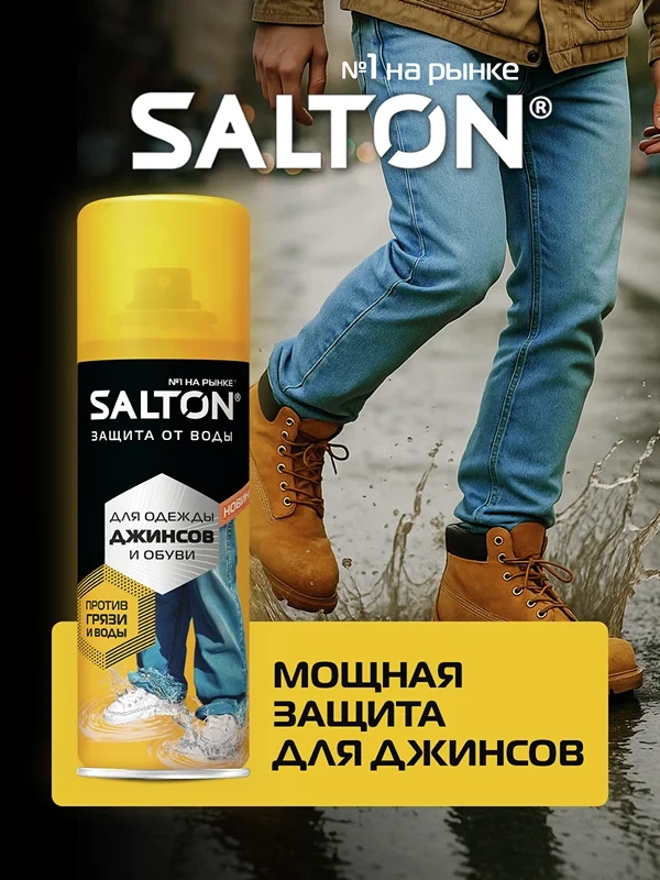 Защита от воды и грязи для джинсов и одежды от Salton. Мокрые джинсы больше не проблема. Инновационное водоотталкивающее средство Salton создает невидимый защитный слой, который обладает рядом преимуществ: