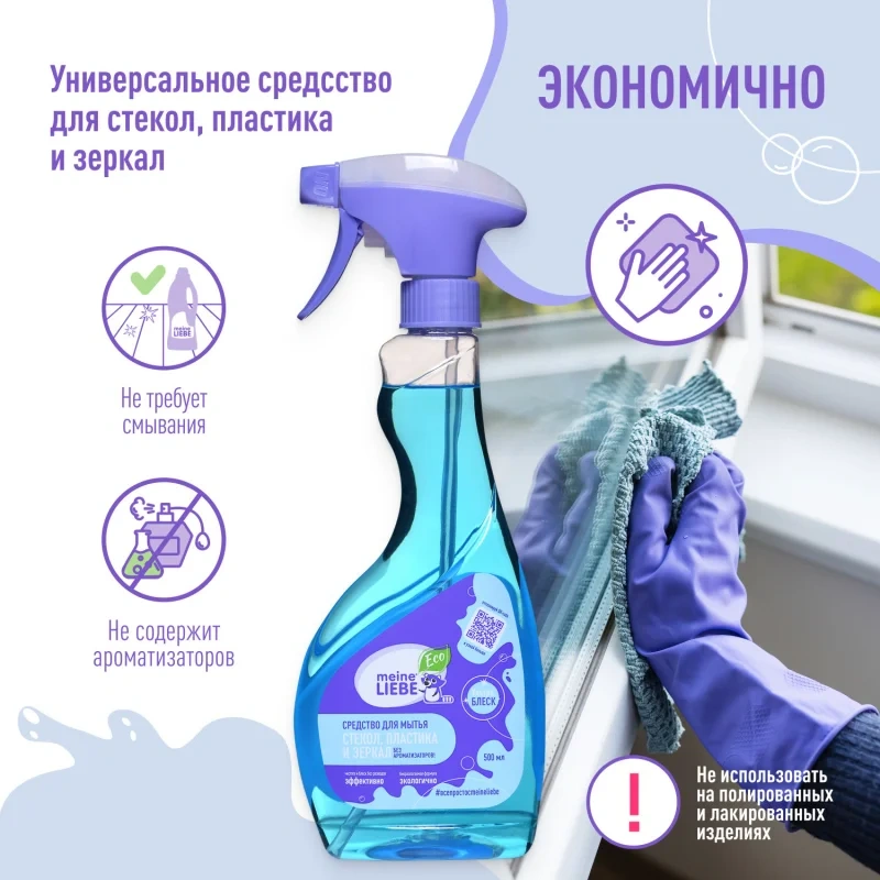 Экологичное средство Майне Либе предназначено для высокоэффективного и безопасного мытья гладких, блестящих поверхностей дома, в офисе и даже на автомобиле. Спрей обеспечивает безупречную чистоту окон, зеркал, пластика, кафеля, винила, акрила и других видов водостойких материалов и покрытий. Специальная формула моющего средства позволяет эффективно справляться со следами пальцев рук, пылью, следами от насекомых, брызгами от средств для умывания и множественными бытовыми загрязнениями. Средство обладает антистатическим эффектом, борется с неприятными запахами и оставляет ягодный аромат после уборки.