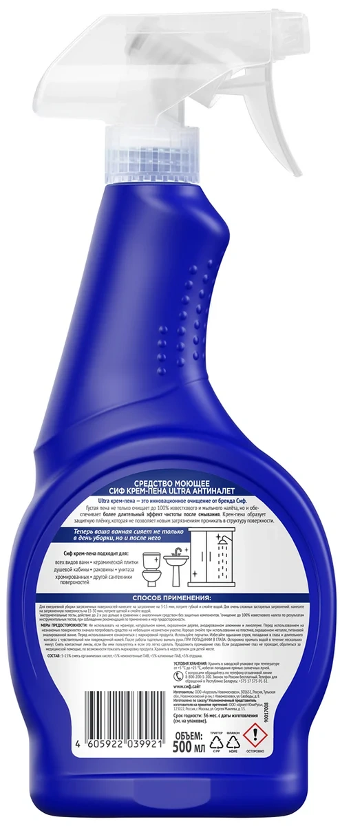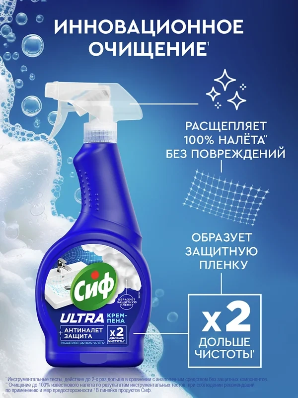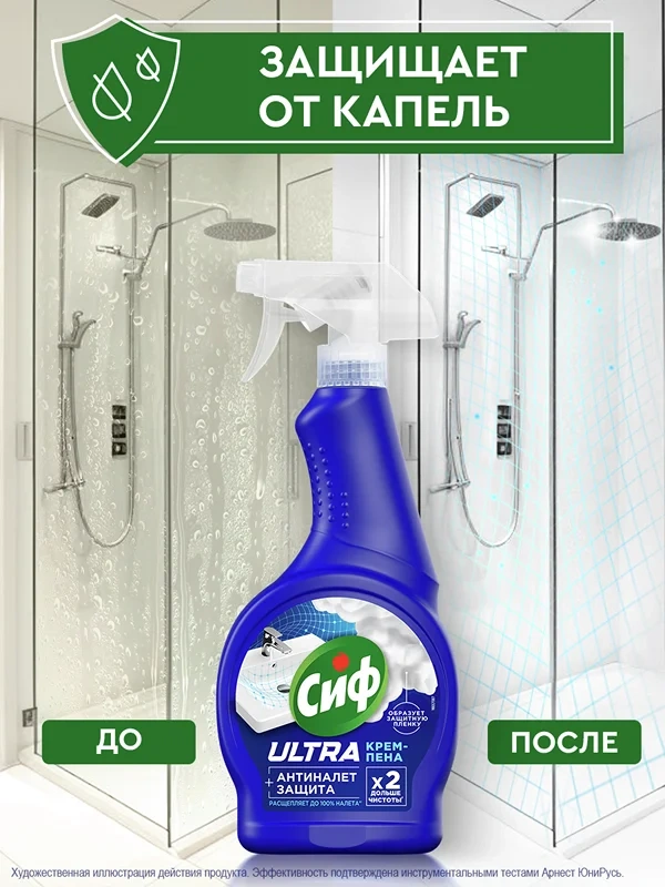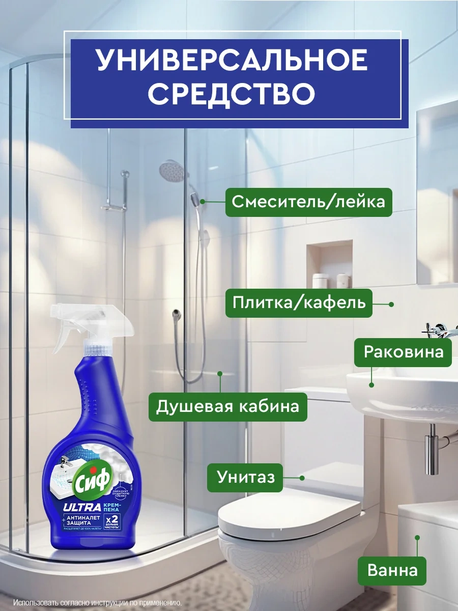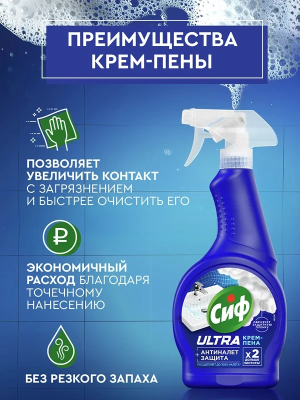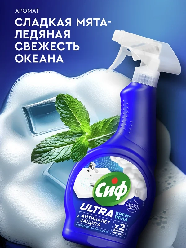 Чистящее средство спрей Антиналет для сантехники Сиф - это ваш надежный помощник в борьбе с загрязнениями в ванной и туалете. Крем-пена для уборки эффективно расщепляет до 100% налета, не повреждая поверхности и не оставляя резкого запаха.