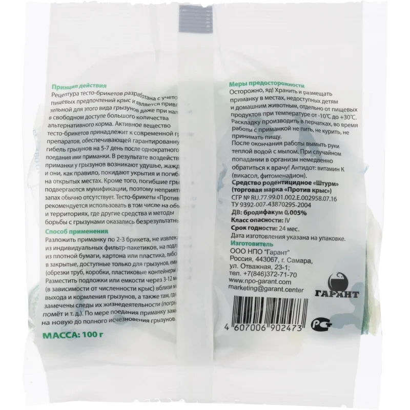 Общая характеристика: родентицидная приманка для уничтожения грызунов Способ применения: приманку размещают в местах, где обнаружены следы жизнедеятельности грызунов (на путях перемещения, вдоль стен, перегородок, возле нор). Раскладывают приманку в сухих местах под укрытиями в приспособленных емкостях или в специальных контейнерах. Приманку раскладывают по 30–50 г при обработках от крыс и по 10–20 г от мышей. Меры предосторожности: обработку проводить в специальной одежде и резиновых перчатках, избегать попадания в глаза, рот и на кожу. Во время работы запрещено курить, принимать пищу, пить, после работы необходимо вымыть руки теплой водой с мылом. Средство в местах его применения должно быть не доступно для детей и домашних животных.