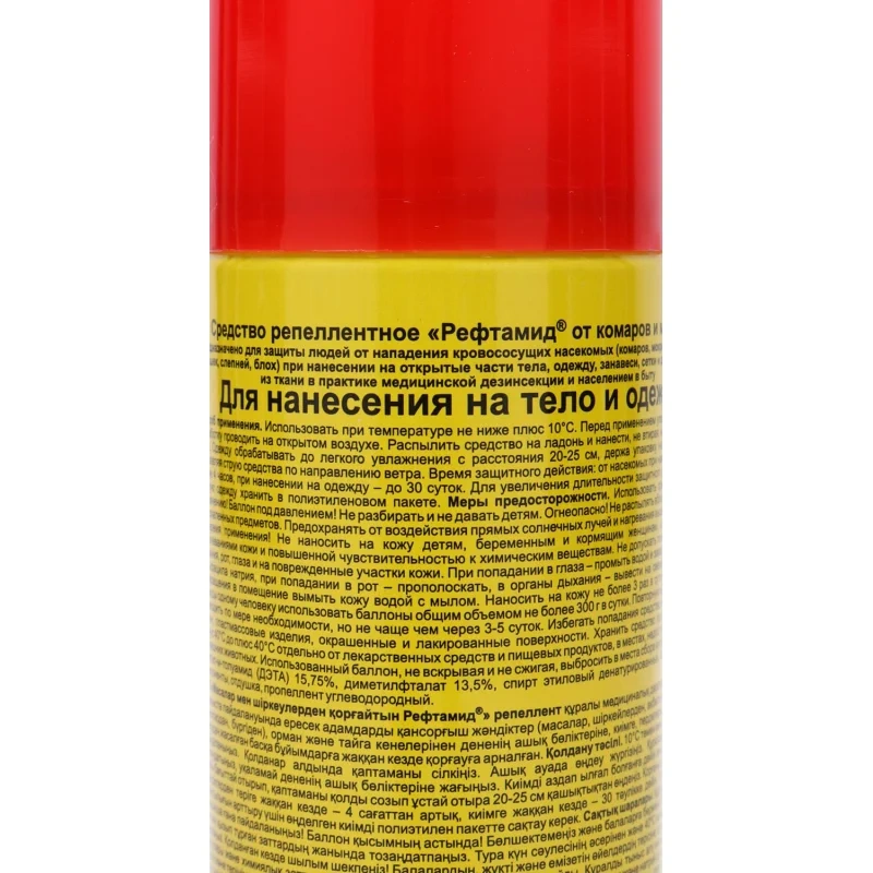 Состав: N,N-Диэтил-3-метилбензамид (ДЭТА) 15,75%, диметилфталат 13,5%, бутан/пропан/изобутан смесь >30%, спирт этиловый денатурированный 15%-30%, глицерин <5%, натрий тетраборнокислый <5%.