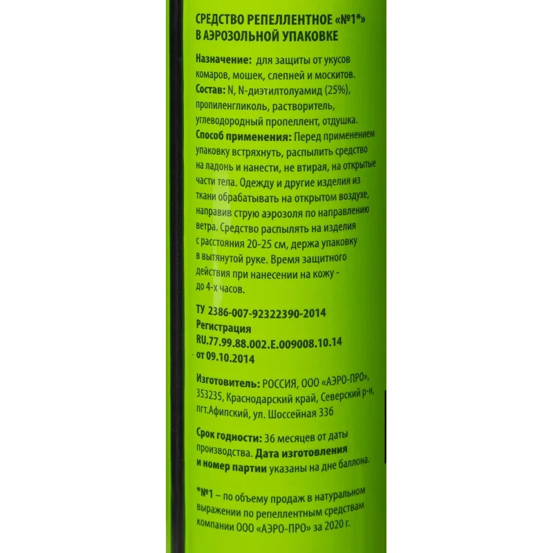 Состав: N,N-диэтил-м-толуамид (ДЭТА) 25,0%, пропиленгликоль, отдушка, растворитель, пропан/бутан/изобутан. Не содержит озоноразрушающих веществ.