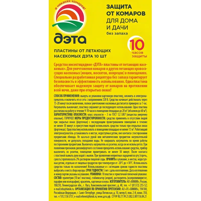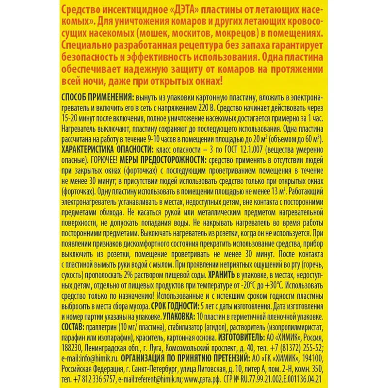 Назначение: Пластины «Дэта» предназначены для уничтожения комаров и других летающих насекомых, таких как москиты и мошки, в помещениях. Одна пластина обеспечивает надёжную защиту от комаров на протяжении всей ночи.