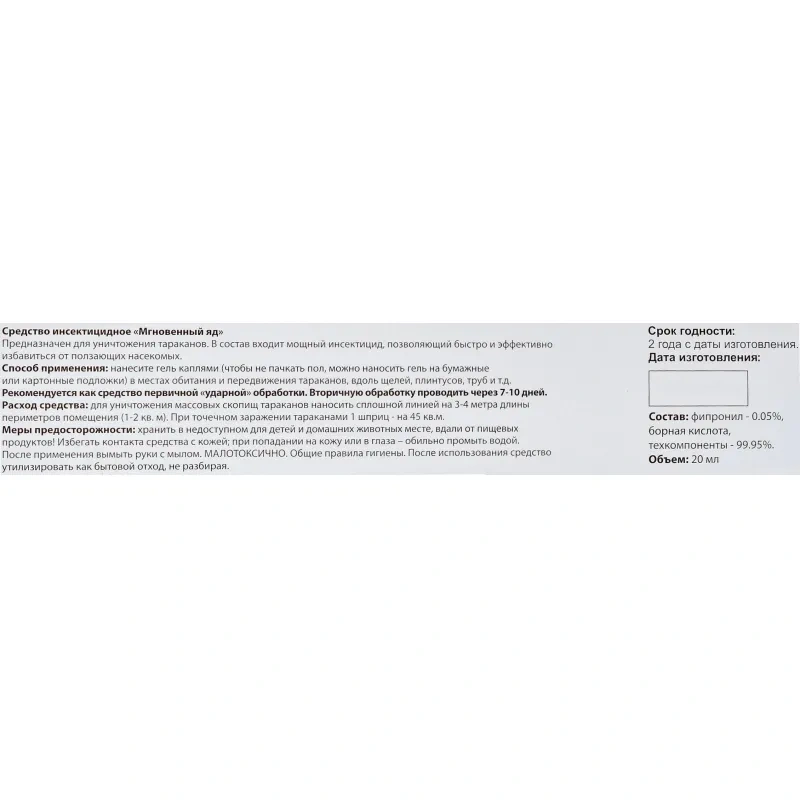 Способ применения: Наносить гель каплями в местах обитания и передвижения насекомых.