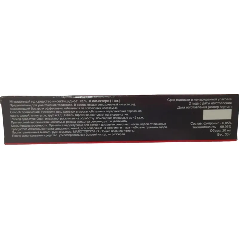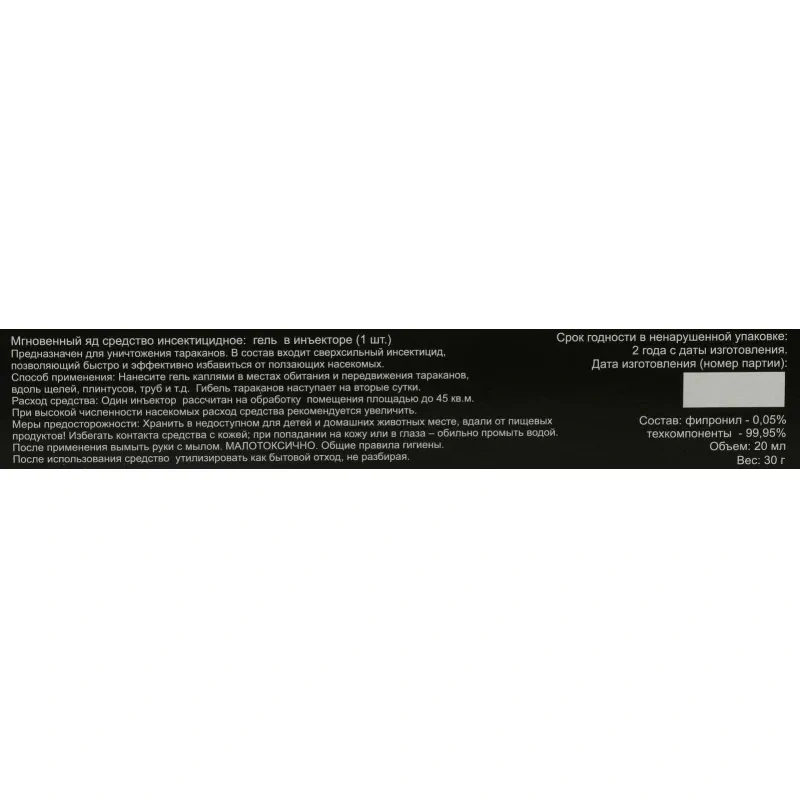 Способ применения: Наносите гель каплями в местах обитания и передвижения насекомых, таких как щели в стенах, под раковинами, за мебелью и в других местах, где часто появляются тараканы.