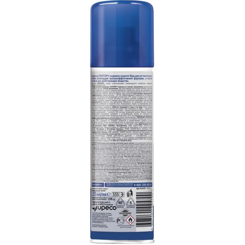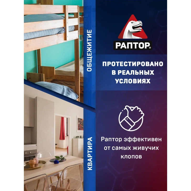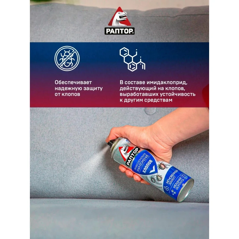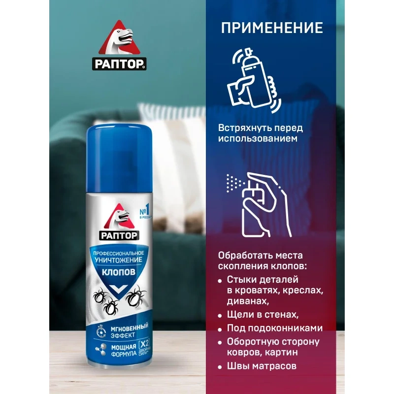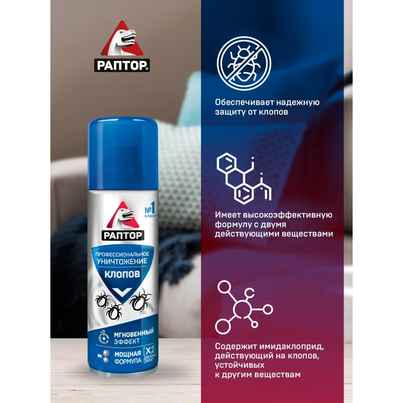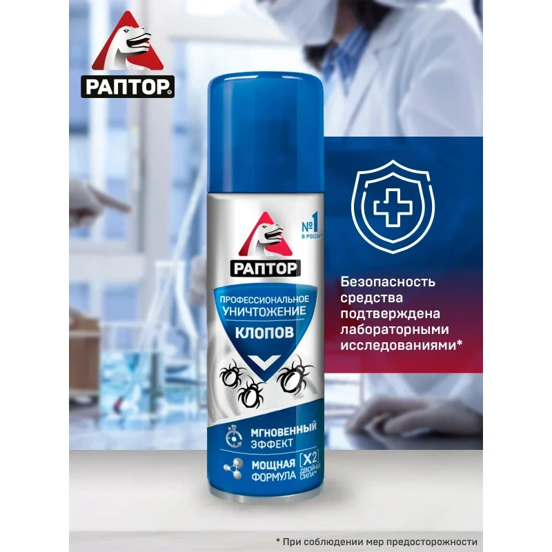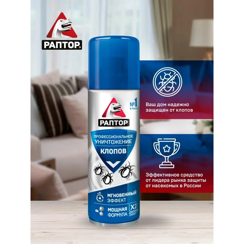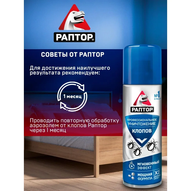Назначение: Если клопы становятся хозяевами в вашем доме и не дают вам покоя, то пришло время положить конец этой войне с аэрозольным средством от РАПТОР! Это профессиональное средство помогает уничтожить не только обычных постельных клопов, но и их резистентных собратьев, которые устойчивы к другим инсектицидам. Благодаря инновационной формуле с двумя высокоэффективными действующими веществами, аэрозоль превращается в мощное оружие против этих назойливых насекомых. Средство эффективно уничтожает клопов, а также предотвращает их возвращение.