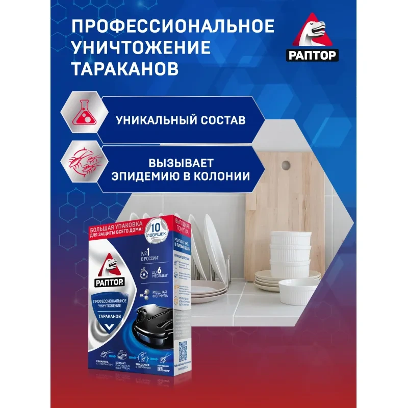 Назначение: С помощью инновационной ловушки избавиться от тараканов проще простого. Больше не нужно мириться с непрошеными гостями, бесконечно заполняющими вашу квартиру. Забудьте об этих рыжих захватчиках, которые не стесняются ни вас, ни ваших друзей. Ловушка «Раптор» с уникальной формулой, включающей два активных вещества, поможет справиться даже с теми тараканами, которые адаптировались к другим средствам. Благодаря удобной конструкции, ловушка практически незаметна и легко крепится к любым вертикальным и горизонтальным поверхностям. Просто разместите ловушки в традиционных местах обитания тараканов — на кухне, в ванной и туалетных комнатах. Если тараканы вернутся, снова используйте проверенные средства «Раптор».