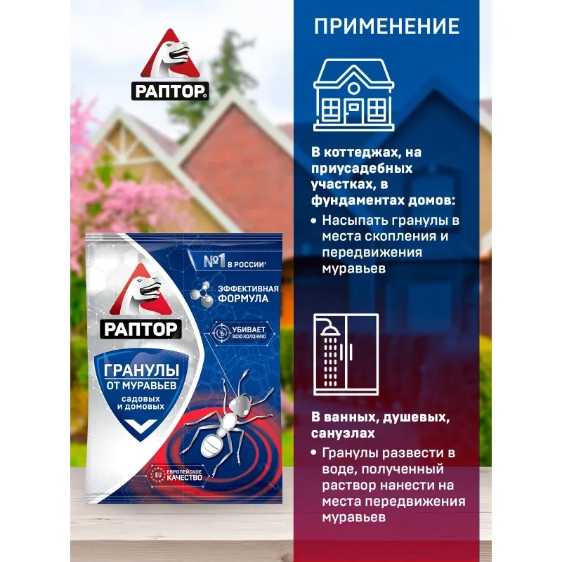 Способ применения: Для уничтожения садовых муравьев на приусадебных участках, в фундаментах домов и коттеджей рекомендуется насыпать гранулы в места их скопления, таких как щели, трещины, швы, а также муравьиные гнезда и тропы. Использовать в сухую безветренную погоду уром или вечером, исходя из расчета 10 г на 1 м² поверхности. При наличии муравьев в парниках или теплицах использовать сухие гранулы из расчета 10 г на 1 м² поверхности или смешивать их с водой (10 г на 0,5 л воды). Для уничтожения муравьев на верандах, террасах и в других помещениях рекомендуется рассыпать сухие гранулы (10 г на 1 м² поверхности) или использовать раствор (10 г на 0,5 л воды) в местах обитания или проникновения муравьев. Для уничтожения рыжих домовых муравьев в ванных, душевых, санузлах, гранулы разводят в воде (10 г на 0,5 л воды) и полученный раствор наносят на пути передвижения муравьев.