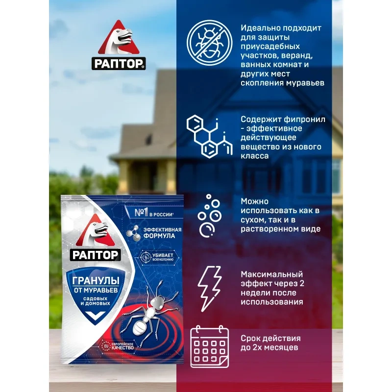 Назначение: Даже заметив не более 1-2 муравьев в доме или на даче, не стоит расслабляться. Скорее всего, это насекомые-разведчики, которые проверяют территорию на пригодность для заселения. Вы и оглянуться не успеете, как к ним подтянутся сотни и тысячи других беспардонных сородичей, и скоро в вашем доме станет тесновато. А к ежедневным хлопотам добавится еще одна головная боль. Начните действовать немедленно! Средство от муравьев РАПТОР в гранулах — настоящее спасение от всех видов домашних и садовых муравьев. Проявите наблюдательность — проследите маршрут перемещения этих мелких вредителей. Он приведет вас к местам их «гнездования». Гранулы РАПТОР можно рассыпать по пути следования и в очагах скопления муравьев (из расчета 10 г на 1 кв. м) или использовать в виде раствора (10 г на 0,5 л воды). Приманка-аттрактант, входящая в состав гранул, привлекает насекомых, а действующее вещество фипронил — воздействует на них снаружи и изнутри, полностью парализуя через 8 часов после первого контакта. Максимальный эффект наступит уже через две недели (!) после обработки территории. И в течение ближайших двух месяцев муравьи вас не побеспокоят. При повторном появлении особей обработку необходимо повторить. Доверьтесь европейскому качеству РАПТОР! Раптор-эффект: понасекомых нет! Секрет популярности средства от муравьев РАПТОР в гранулах: — Европейское качество; — Идеально подходит для защиты приусадебных участков, теплиц, веранд, кухонь, ванных комнат и других мест скопления муравьев; — Возможно использовать как в сухом, так и в растворенном виде; — Максимальный эффект достигается через 2 недели после начала использования; -Пролонгированный срок действия средства — до 2-х месяцев.