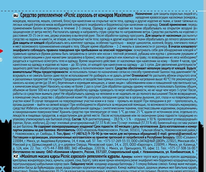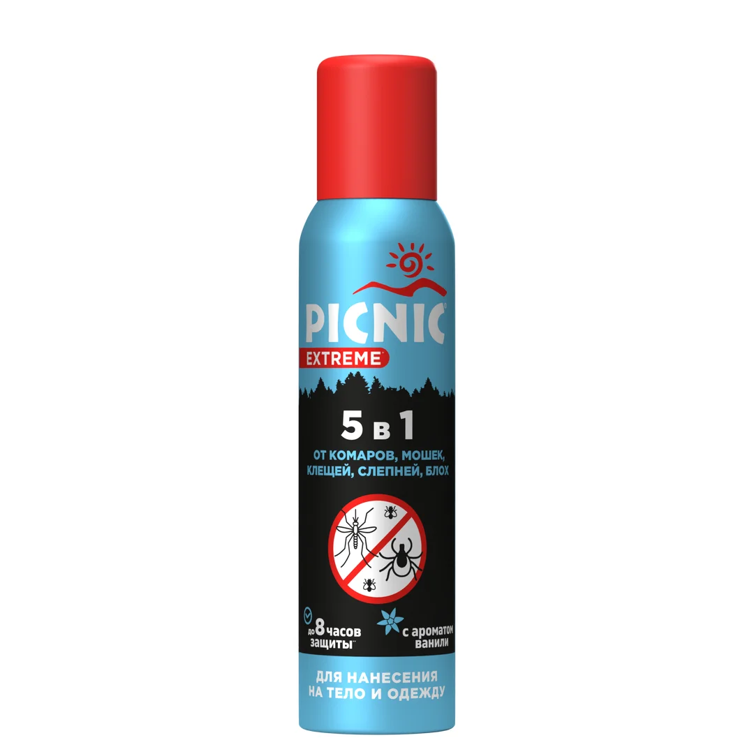 Репеллент серии Picnic Extreme 5 в 1 - средство от комаров, мошки, таежных и лесных клещей, слепней и блох с ароматом ванили, наносится на кожу, не втирая, и на одежду. При нанесении на одежду спрей от всех летающих Пикник отпугивает насекомых до 30 суток, клещей - до 5 суток. При нанесении на кожу - время защитного действия - более 4 часов. При обработке одежды для защиты от клещей необходимо распылить средство от кровососущих насекомых до легкого увлажнения ткани, при этом надевать ее можно исключительно на нательное белье и только после полного высыхания.