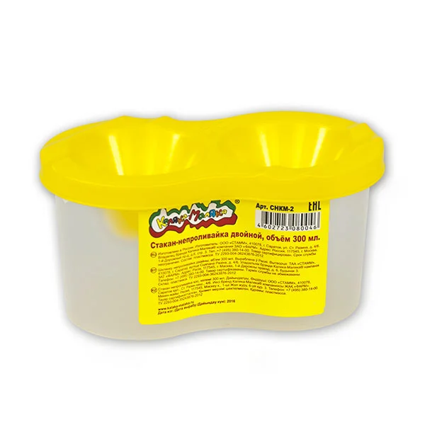 Стакан-непроливайка Каляка-Маляка сохранит рабочее место ребенка в чистоте. Позволяет не расплескать воду из стакана даже при его опрокидывании (при наполнении стакана водой не выше специальной отметки). Имеет удобную, плотную крышку солнечного ярко-желтого цвета. Крышка приспособлена для удобного расположения на ней кисточек.