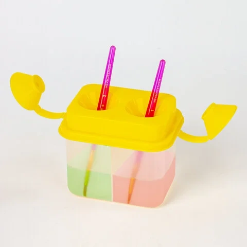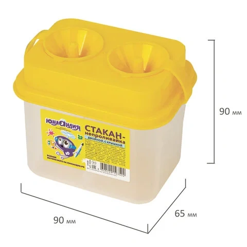 Специальная форма заглушки в крышке стакана исключает возможность вытекания воды. 2 увеличенные вместительные ёмкости для воды. Линия на прозрачном корпусе указывает на максимально возможный уровень наполнения. Выполнен из прочного пластика. Имеются специальные углубления на крышке для размещения кисточек. Полный объем - 350 мл. Объем до уровня - 80 мл.
