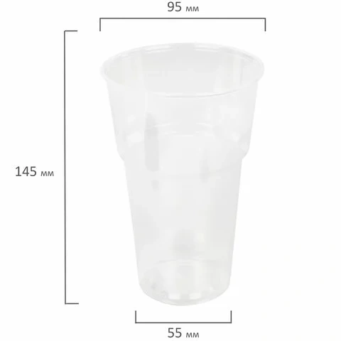 Изготовлены из экологически чистого полимера – полипропилена. Пригодны для использования в микроволновых печах. Прозрачные стаканы объемом 500 мл предназначены для холодных и горячих напитков (до +75 °C). Диаметр – 95 мм. Поставляются комплектом по 50 штук.