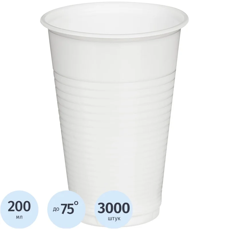 Стакан одноразовый Бюджет 200мл, пластиковый белый, 3000шт/уп