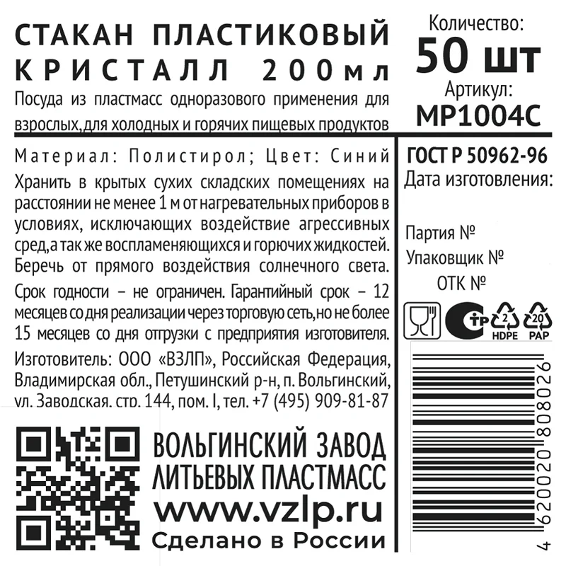 Стакан одноразовый Vzlp Кристалл пластиковый синий 200мл, 50шт