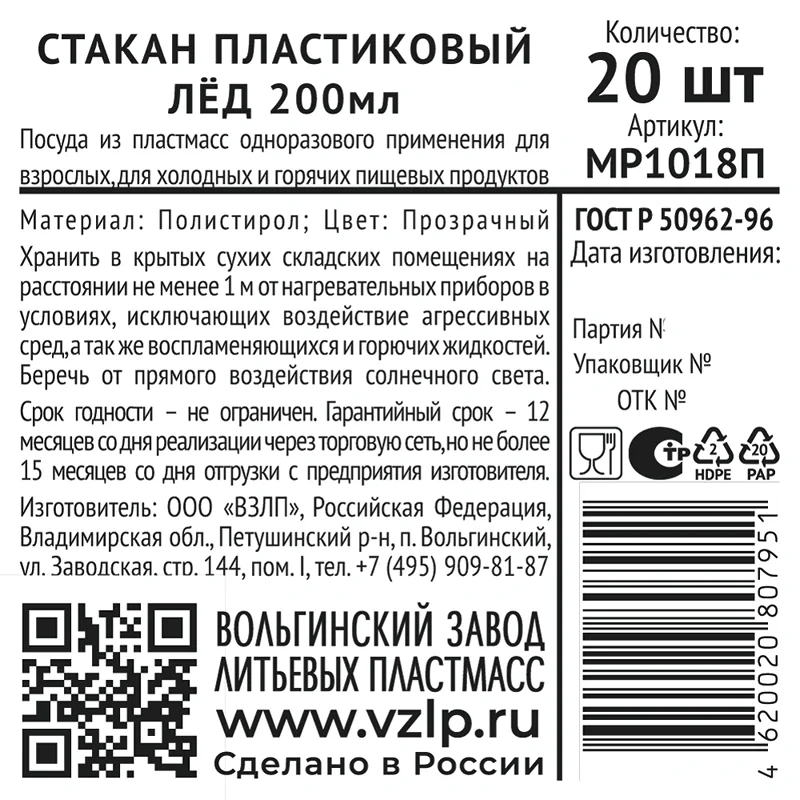 | Комплектация | стакан пластиковый, 200 мл - 20 шт. |