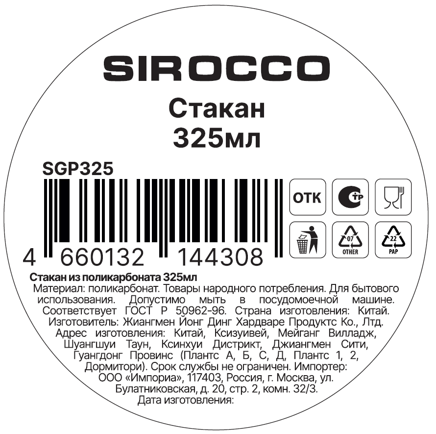 Стакан Sirocco поликарбонат, 325мл