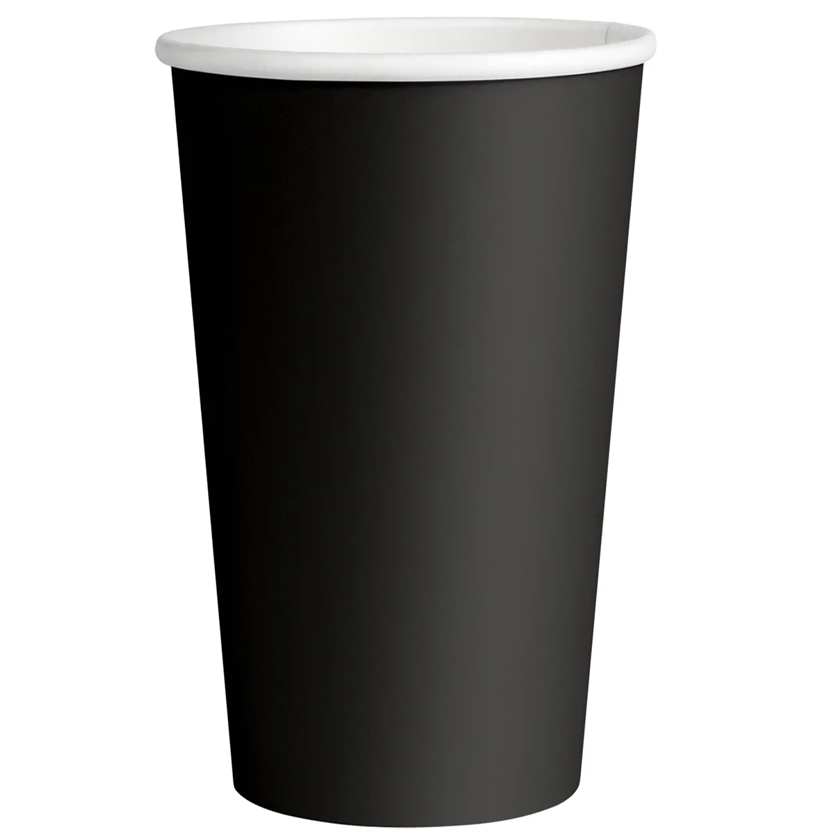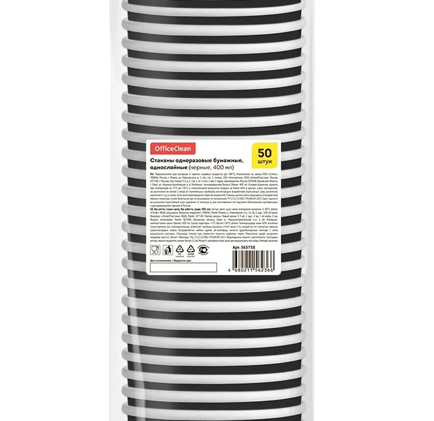 Одноразовые стаканы OfficeClean в стильном чёрном цвете предназначены для офисных столовых, образовательных и производственных учреждений, предприятий общественного питания, которые реализуют горячие и холодные напитки навынос. В наборе представлено 50 штук. Стаканы объёмом 400 мл изготовлены из ламинированной бумаги.