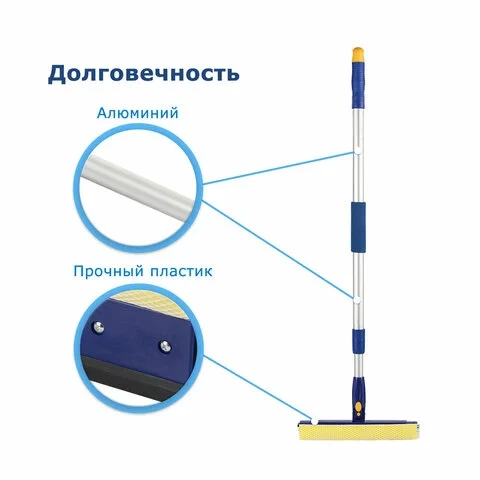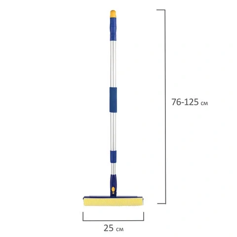 Выполняет две функции: мытье стеклянной поверхности с помощью спонжа и сгон воды резиновым лезвием. Телескопическая ручка с вращающейся рабочей частью упрощает уборку. Выполнена из алюминия. Длина ручки - 68 -121 см. Ширина рабочей части - 25 см.