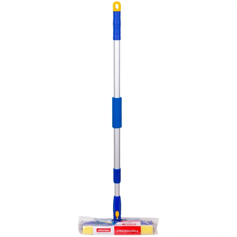 Стекломойка OfficeClean Professional с вращающейся головкой, включает в себя 2 функции: мойка стекол губкой и удаление воды резиновой кромкой. Моющая поверхность поворачивается на 180 градусов. Телескопическая ручка упрощает доступ к труднодоступным местам. Материал моющей части: губка поролон, резина, пластик