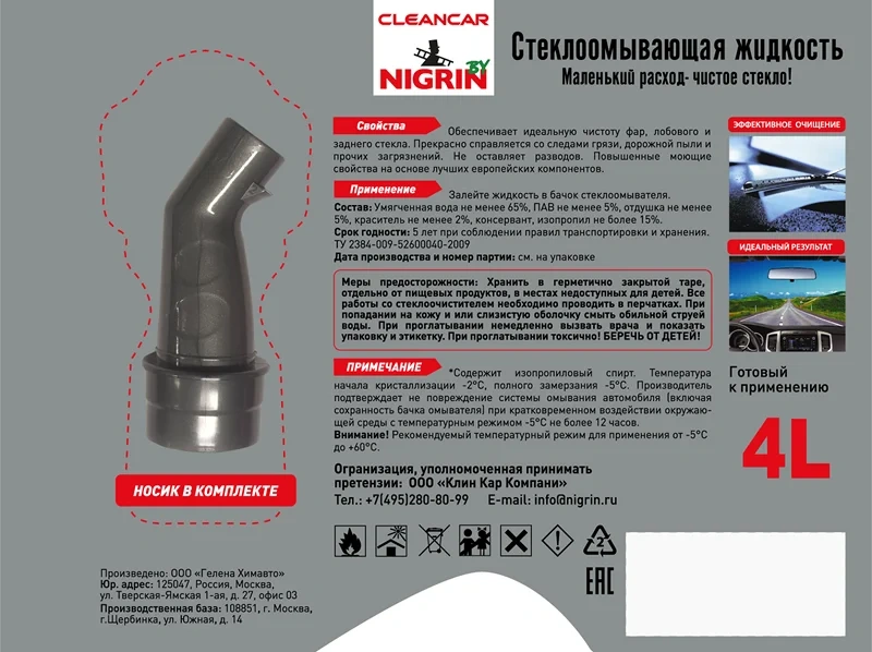 Незамерзающая жидкость для омывателя стекла эффективно удаляет снег, лед, антигололедные реагенты, копоть, соль и грязь с поверхности стекла. После использования не оставляет разводов и следов на поверхности после прохода стеклоочистителей и высыхания.