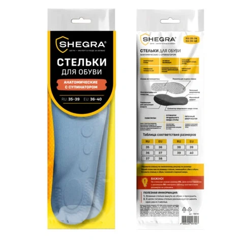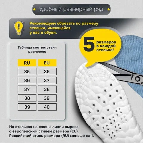 Стельки для обуви с европейским размером EU 36-40, что соответствует российскому размеру RU 35-39. На стельках указан европейский стандарт размера EU, а также нанесены линии выреза. Для удобства на упаковке приведена таблица соответствия размеров RU/EU.