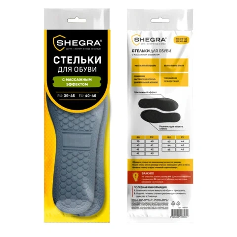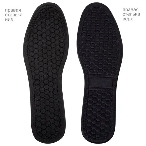 Стельки для обуви с европейским размером EU 40-46, что соответствует российскому размеру RU 39-45. На стельках указан европейский стандарт размера EU, а также нанесены линии выреза. Для удобства на упаковке приведена таблица соответствия размеров RU/EU.