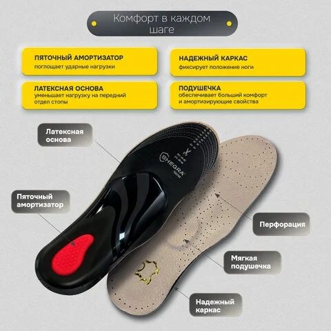 Стельки для обуви с российским размером RU 39-45, что соответствует европейскому размеру EU 40-46. На стельках указаны оба стандарта размера: RU и EU, а также нанесены линии выреза. Для удобства на упаковке приведена таблица соответствия размеров RU/EU.