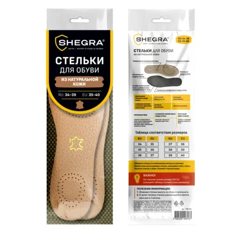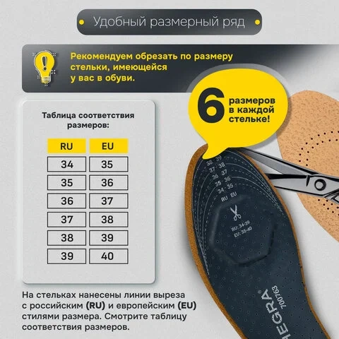 Стельки для обуви с российским размером RU 34-39, что соответствует европейскому размеру EU 35-40. На стельках указаны оба стандарта размера: RU и EU, а также нанесены линии выреза. Для удобства на упаковке приведена таблица соответствия размеров RU/EU.