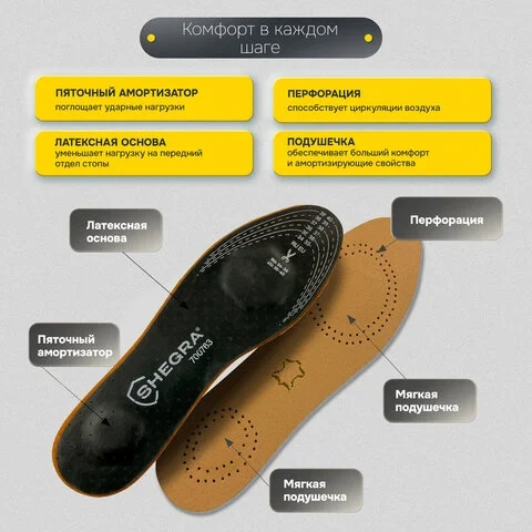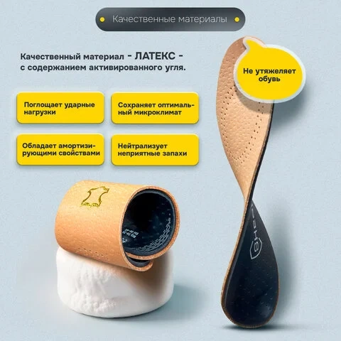 Основа стелек выполнена из латексной пены с добавлением активированного угля, который предотвращает появление и размножение бактерий, надолго нейтрализует неприятные запахи. Латексная пена снижает и поглощает ударные нагрузки при ходьбе. Супинатор поперечного свода стопы уменьшает нагрузку на передний отдел стопы, а пяточный амортизатор снижает и поглощает ударную нагрузку на пятку. Поверхность стелек выполнена из натуральной кожи, которая обеспечивает воздухопроницаемость, сохраняя свежесть в обуви. Перфорация способствует дополнительной вентиляции, создавая оптимальный микроклимат.