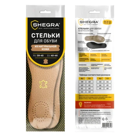 Стельки для обуви с российским размером RU 39-45, что соответствует европейскому размеру EU 40-46. На стельках указаны оба стандарта размера: RU и EU, а также нанесены линии выреза. Для удобства на упаковке приведена таблица соответствия размеров RU/EU.