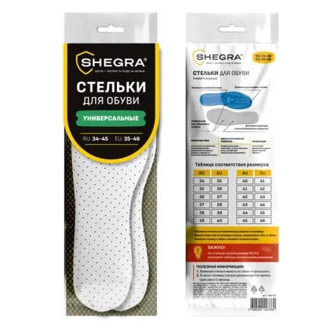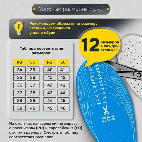 Стельки для обуви с российским размером RU 34-45, что соответствует европейскому размеру EU 35-46. На стельках указаны оба стандарта размера: RU и EU, а также нанесены линии выреза. Для удобства на упаковке приведена таблица соответствия размеров RU/EU.