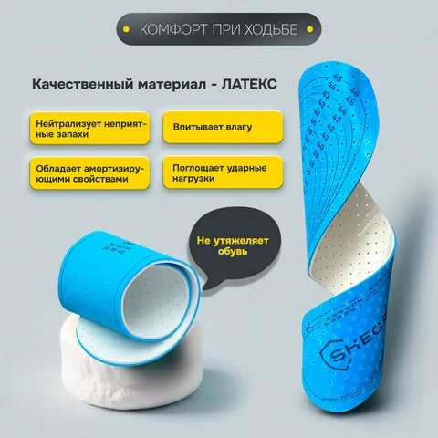 Латексная пена снижает и поглощает ударные нагрузки при ходьбе, а хлопчатобумажное покрытие впитывает влагу и сохраняет ноги сухими. Перфорация способствует циркуляции воздуха и нормализации микроклимата у вас в обуви.